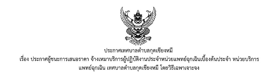 ประกาศเทศบาลตำบลกุดเชียงหมี เรื่อง ประกาศผู้ชนะการเสนอราคา จ้างเหมาบริการผู้ปฏิบัติงานประจำหน่วยแพทย์ฉุกเฉินเบื้องต้นประจำ หน่วยบริการแพทย์ฉุกเฉิน