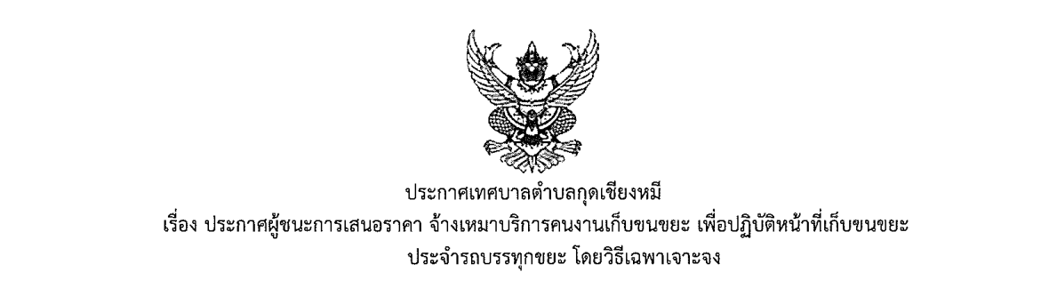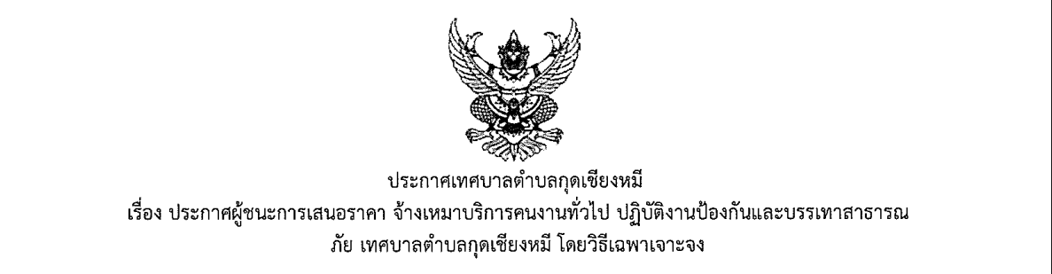 ประกาศเทศบาลตำบลกุดเชียงหมี เรื่อง ประกาศผู้ชนะการเสนอราคา จ้างเหมาบริการคนงานเก็บขนขยะ เพื่อปฏิบัติหน้าที่เก็บขนขยะ ประจำรถบรรทุกขยะ โดยวิธีเฉพาะเจาะจง