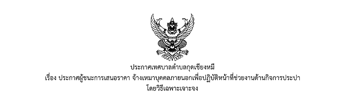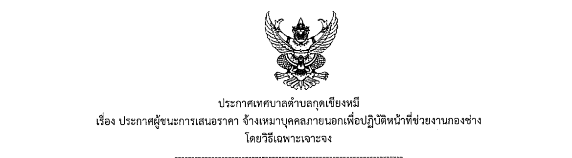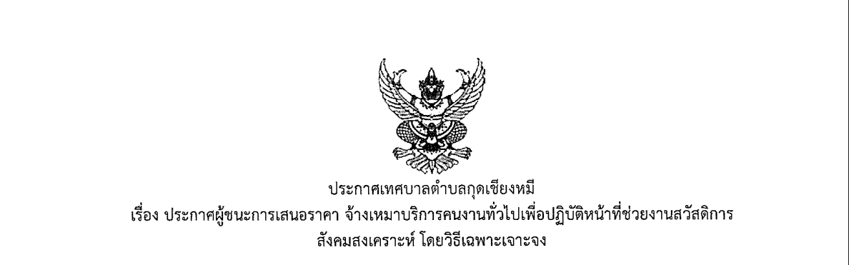 ประกาศเทศบาลตำบลกุดเชียงหมี เรื่อง ประกาศผู้ชนะการเสนอราคา จ้างเหมาบริการคนงานทั่วไปเพื่อปฏิบัติหน้าที่ช่วยงานสวัสดิการสังคมสงเคราะห์