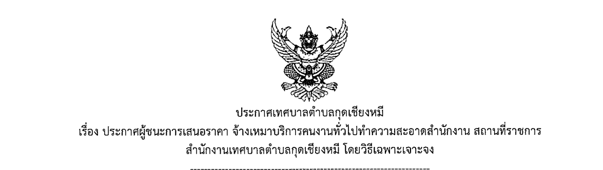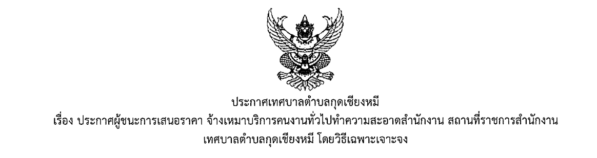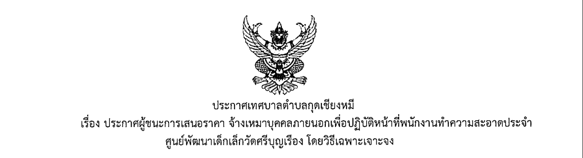 ประกาศเทศบาลตำบลกุดเชียงหมี เรื่อง ประกาศผู้ชนะการเสนอราคา จ้างเหมาบุคคลภายนอกเพื่อปฏิบัติหน้าที่พนักงานทำความสะอาดประจำศูนย์เด็กเล็ก โดยวิธีเฉาพาะเจาะจง