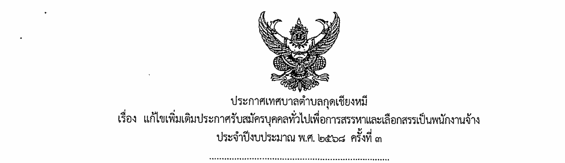 ประกาศเทศบาลตำบลกุดเชียงหมี เรื่อง แก้ไขเพิ่มเติมประกาศรับสมัครบุคคลทั่วไปเพื่อการสรรหาและเลือกสรรเป็นพนักงานจ้างประจำปีงบประมาณ พ.ศ.2568 ครั้งที่ 3