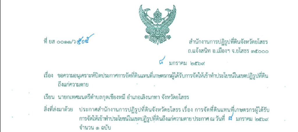 - ประชาสัมพันธ์ !! ประกาศสำนักงานการปฏิรูปที่ดินจังหวัดยโสธร เรื่อง การจัดที่ดินแทนที่เกษตรกรผู้ได้รับการจัดให้เข้าทำประโยชน์ในเขตปฏิรูปที่ดิน ถึงแก่ความตาย , 6 กุมภาพันธ์ 2569